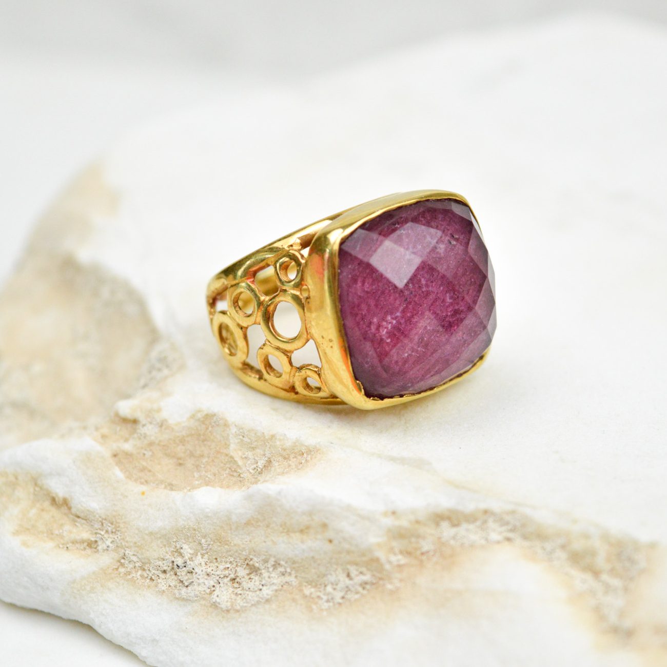 Επίχρυσο δαχτυλίδι με ημιπολύτιμο λίθο Ρουμπινι ντουμπλέτα σε τετράγωνο σχήμα.